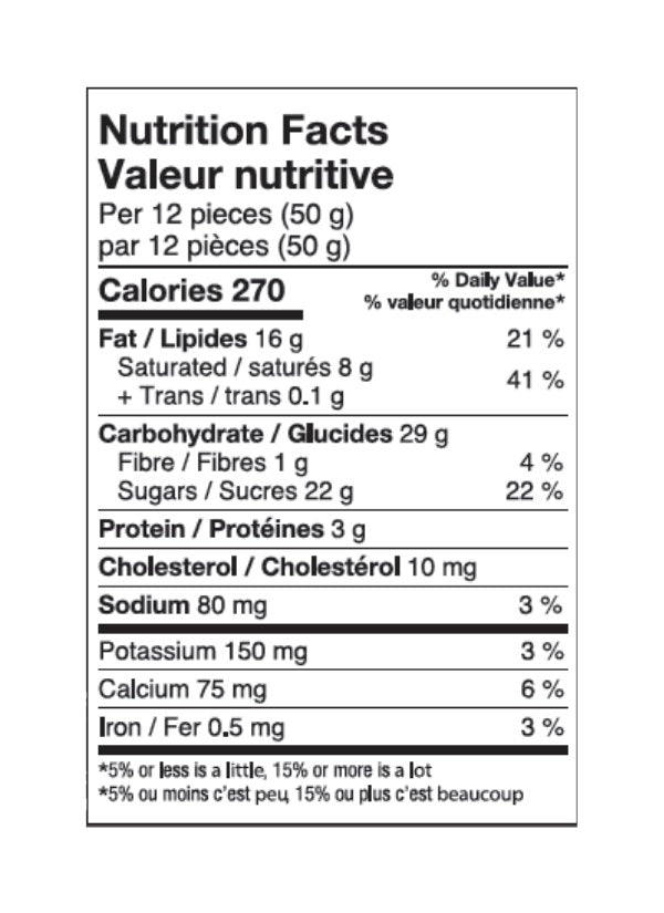 Ingredients: Milk chocolate (sugar, milk, cocoa butter, chocolate liquor, soy lecithin, vanilla) • Potato chips (potatoes, vegetable oil, salt). Contains: Milk • Soy May Contain: Peanuts • Nuts • Wheat Ingrédients: Chocolat au lait (sucre, lait, beurre de cacao, liqueur de chocolat, lécithine de soja, vanille) • croustilles (pommes de terre, huile végétale, sel). Contient: Lait • soja Peut contenir: Arachides • noix bis